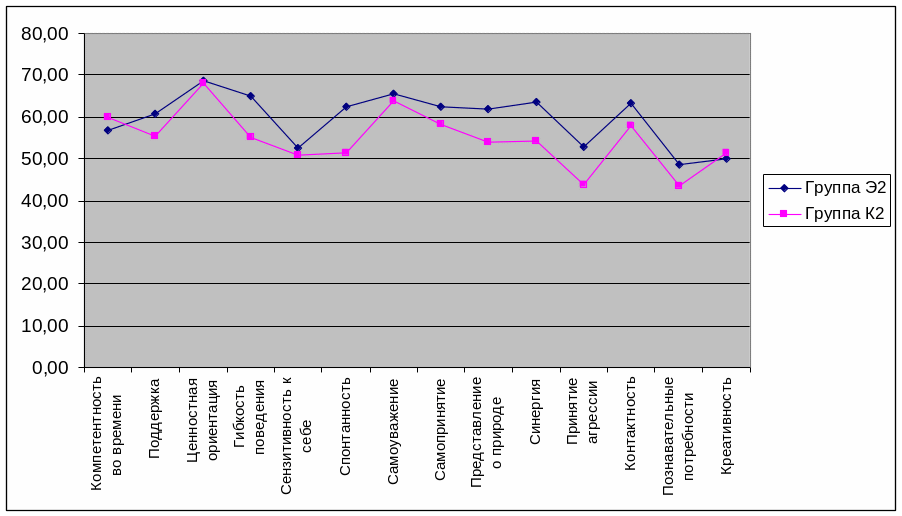 Дисперсии значений, полученных по шкалам методики Шострома, в группах Э2 и К2 были сравнены по t-критерию Стьюдента для независимых выборок (распределение признаков соответствует нормальному).