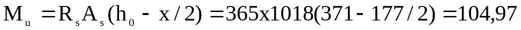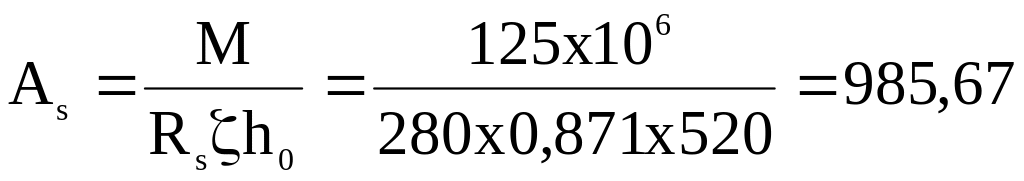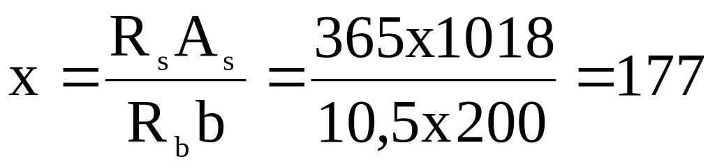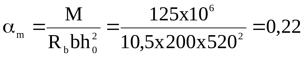 Rb=10,5 МПа (для класу В20 і b2 =0,9 за 2, табл.8, стор. 12), b2 коефіцієнт умов роботи бетону; при дії на конструкцію постійного, довготривалого й короткочасного навантаження дорівнює 0,9 та визначається згідно з 2, п. 3.1, стор. 17; Rs= 365 МПа (для класу А-ІІІ, 10...40 мм за 2, табл. 15, стор. 16).
