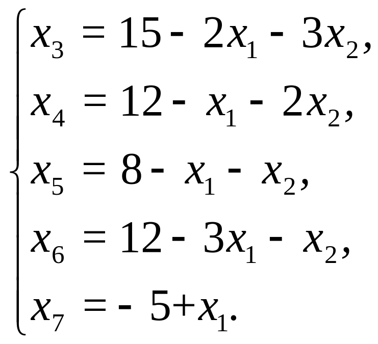 Если каждая дополнительная переменная входит в уравнение с тем же знаком, что и свободный член, стоящий в правой части уравнения, то дополнительные переменные можно брать в качестве основных на первом шаге (см. Пример 2).
