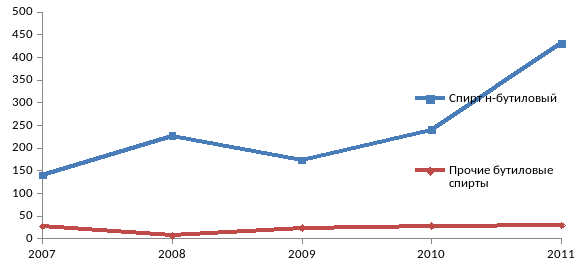 За период с 2007 по 2011 гг стоимостный объем импорта бутилового спирта в Россию вырос в 2,8 раза: с 0,17 до 0,46 тыс долл.