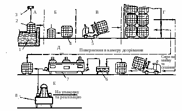 А – солильне відділення; Б – приміщення для обсушування і перевантаження; 8 – транспортування; Г – камера дозрівання сирів; Д – ділянка мийки і сушіння сирів; Е – ділянка нанесення захисної плівки і підготовки сирів до реалізації; I – солильний басейн; 2 – контейнер для посолки сирів; 3 – електроталь; 4 – контейнер для дозрівання сирів; 5 – електровантажник; 6 – машина для мийки сирів; 7 – установка для сушіння сирів після мийки; 8 – електричний парафінер