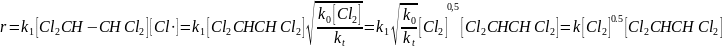 Данное уравнение аналогично данному в задании, следовательно, происходит квадратичный обрыв по радикалу хлора, и механизм реакции имеет следующие элементарные реакции: