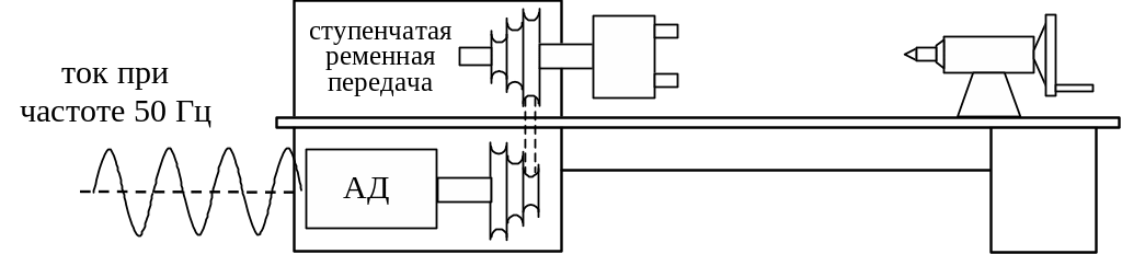 На мал. 2.7 показаний токарний верстат із двигуном змінного струму з постійною швидкістю обертання. Регулювання швидкості здійснюється за допомогою східчастої ремінної передачі. Переміщення приводного паса з одного колеса на інше дозволяє змінювати передаточне число передачі. Найбільше колесо на валу двигуна відповідає найменшому колесу на валу шпинделя й навпаки, для підтримки натягу ременя.
