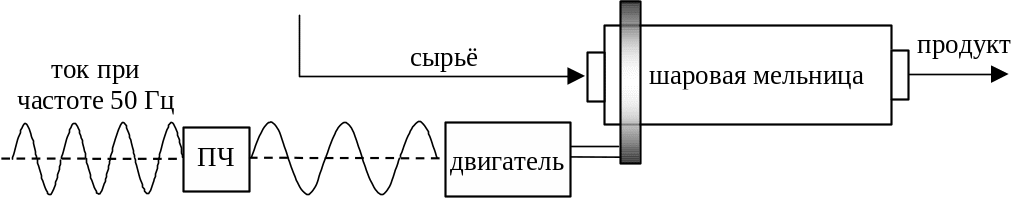 У кульовому млині на мал. 2.6 необхідний ступінь здрібнювання може бути досягнута застосуванням частотно-регульованого привода. Система, що складається з низькошвидкісного синхронного двигуна й перетворювача частоти, є найбільш підходящою комбінацією. Такі системи частотно-регульованого привода використовуються в більших цементних кульових млинах. Синхронні двигуни можуть бути сконструйовані для роботи на низьких швидкостях, навіть нижче 120 об/хв.