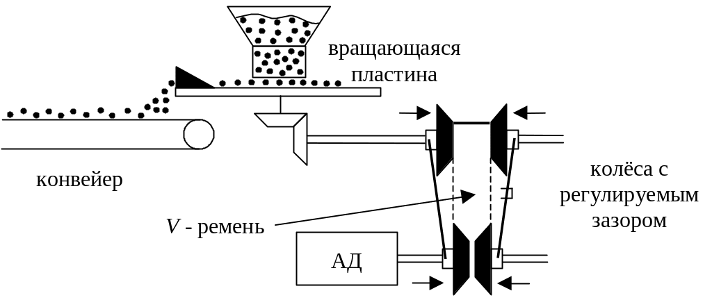 На мал. 2.13 показаний фідер у вигляді обертової пластини із традиційним керуванням. Двигун змінного струму з постійною швидкістю обертання приводить фідер за допомогою ремінної передачі з регульованим зазором барабанів. Переміщенням пари ближче - далі, одночасно переміщаючи іншу пару далі - ближче, можна змінювати передаточне число. Передача розроблена з таким розрахунком, щоб підтримувати постійним натяг V-Ременя. Конструкція з пасовою передачею такого типу, хоча й дозволяє регулювати швидкість безступенево, вимагає істотного механічного обслуговування.