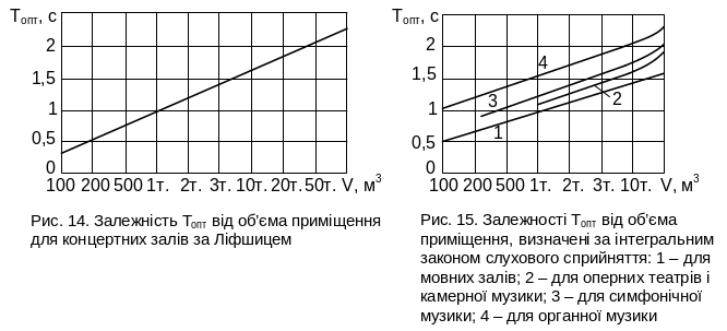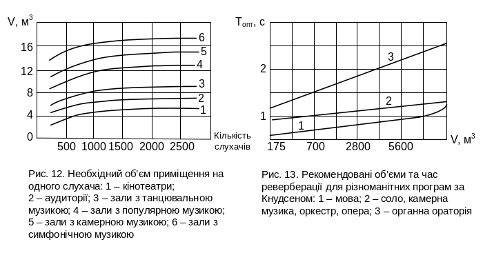 На рис.13 зображено графік залежності оптимальних значень часу реверберації на частоті 500 Гц в залежності від об`єму приміщення для відтворення музики та мови за Кнудсеном [6].