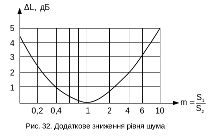 Додаткове зниження рівня шума можна отримати зменшенням площі поперечного перетину повітревода, яке визначається за графіком на рис.32.