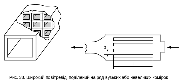 Аналогічно визначають площу Sв поперечного перетину повітреводу. Якщо повітревод розгалужується на n каналів, то перетин кожного каналу після розгалуження: