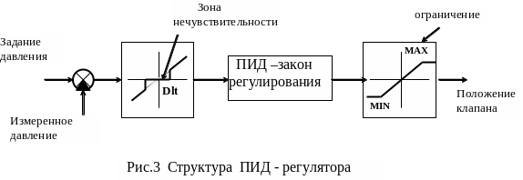 В режиме автоматического регулирования при нормальной эксплуатации насоса расчет положения регулирующего клапана осуществляется с использованием ПИД- закона регулирования с зоной нечувствительности и ограничениями выходного сигнала (рис.3)