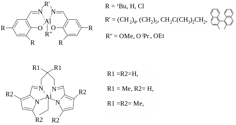 Известно, что физические и механические свойства поли(L-лактида) напрямую зависят от его микроструктуры. Получать синдиотактический и изотактический полимер позволяют алкоксиды алюминия общей формулы LnAl–OR (рисунок 1.23), обладающие объемным лигандом, который представляет собой основание Шиффа с различными заместителями [89, 91-97].