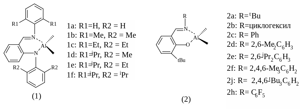 К недостаткам алкоксидов алюминия относят их склонность к агрегации, приводящей к уменьшению активности катализатора. Поэтому исследования последних лет направлены на поиск новых хелатных комплексов алюминия с объемными лигандами различного строения, среди которых наиболее распространенными являются анилидо-(1) [86] и фенокси-иминные (2) [87, 88] (рисунок 1.21).