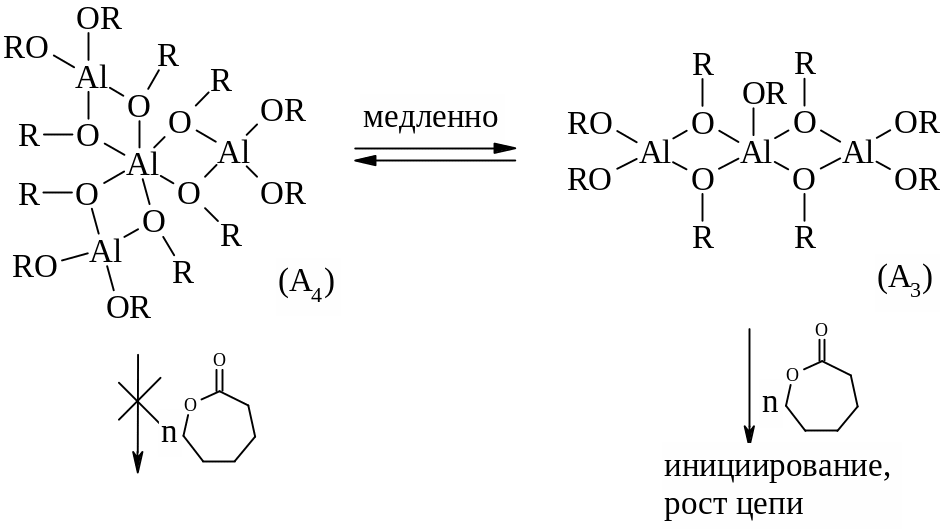 Одним из основных недостатков использования в полимеризации D,L- и L-лактида простых алкоксидов алюминия, например Al(OiPr)3, является их предрасположенность к агрегации. Более того, полимеризация в данном случае характеризуется наличием индукционного периода (10 и более минут), который обусловлен равновесием между тетрамером (А4) и тримером (А3) (рисунок 1.22). Причем А4 в отличие от А3 не является активным и не инициирует рост цепи [3, 4, 61]. Диалкилалюминий алкоксид в растворе не агрегирует, однако его активность в полимеризации D,L- и L-лактида невелика.