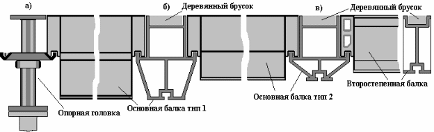 Рис. 1.24. Балки системы TITAN HV: а) - опирание основных балок на опорную головку стойки; б) - опирание основных балок друг на друга;в) - опирание второстепенных балок на основные