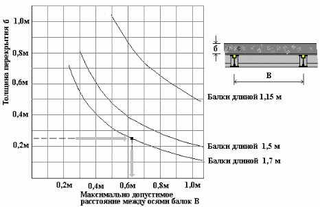 Выбор шага второстепенных балок для фанеры толщиной 20-21мм в зависимости от толщины перекрытия и длины балок выполняется с использованием диаграмм, изображенных на рис. 1.23.