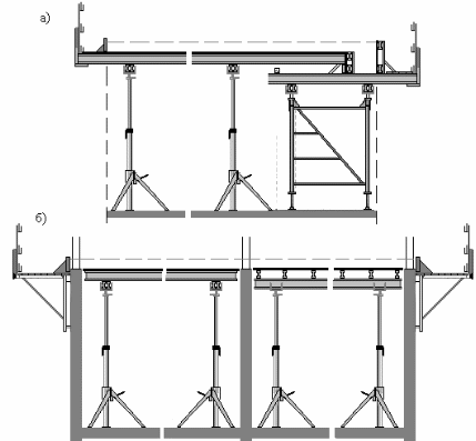 Рис. 1.22. Балочный каркас опалубки перекрытий TITAN HV: а) - сборка опалубки перекрытия с применением балочного каркаса; б) - разборка опалубки перекрытия с использованием опускаемых головок