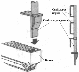 В ходе проектирования опалубки перекрытий должно быть предусмотрено обустройство краевых зон опалубки для обеспечения безопасной работы рабочих при укладке бетона. Примеры такого обустройства и используемые приспособления представлены на рис. 1.26, 1.27. Следует обратить внимание на возможность формирования пространственных опор-туров из стоек и навесных рам (рис. 1.26а, 1.27б), однако приводимые в пособии каталоги элементов опалубок перекрытий не содержат сведений об инвентарных связевых рамах и устройствах для их закрепления на стойках.