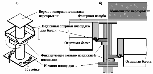 Опускаемая опора балок изображена на рис. 1.25. Ее применение, как упоминалось выше, позволяет производить разборку опалубки без снятия стоек с сохранением их в качестве промежуточных опор перекрытия при низких прочностях бетона (30, 40 или 50% от прочности в 28-ми суточном возрасте в зависимости от класса используемого бетона, шага стоек и толщины перекрытия). Фанерные листы или опалубочные панели, зажатые между верхней опорной площадкой и нижней плоскостью монолитного перекрытия, не снимаются все время использования стойки в качестве промежуточной опоры перекрытия во время дозревания бетона перекрытий до прочности 70,...80% от R28.