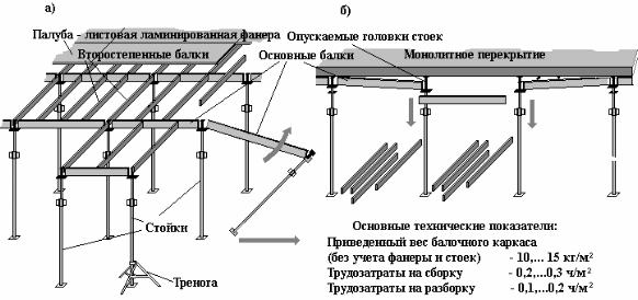 В общем виде опалубка такого рода формируется из системы основных элементов, в которую входят легкие тонкие панели палубы - щиты, балки и телескопические стойки. Размеры и масса основных элементов ограничены необходимостью ручной разборки опалубки в зонах под готовым перекрытием, недоступных для применения крана.