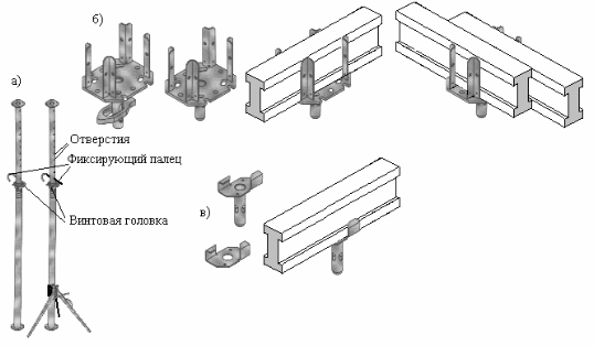 Рис. 3. Конструктивные решения стоек и опорных головок системы DOKAFLEX: а - стойки, одна из которых оснащена треногой для придания устойчивости; б) 4-х ходовые инвентарные головки стоек и их использование для фиксации главных балок; в) - головка для промежуточных стоек