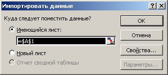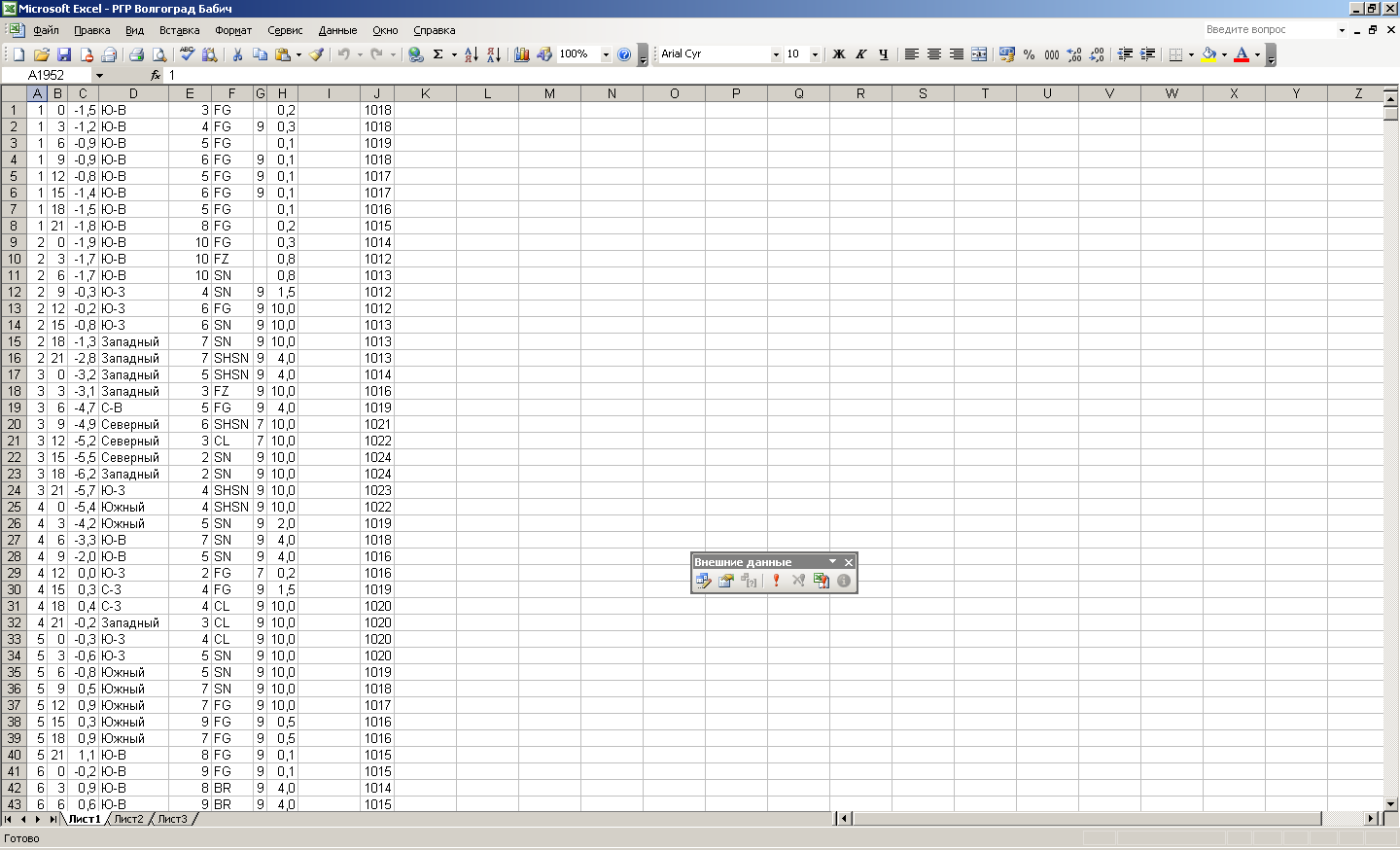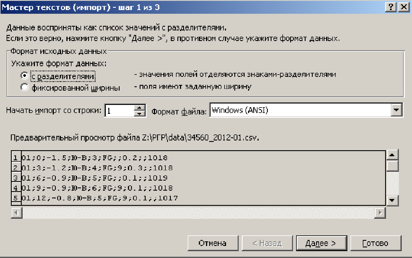 Выполните описанные действия для данных метеорологических измерений для всех месяцев года. После импортирования данных каждого месяца, установите курсор в первую ячейку первой пустой строки. После щелчка на кнопке Готово адрес этой ячейки отображается в окно Импортировать данные.
