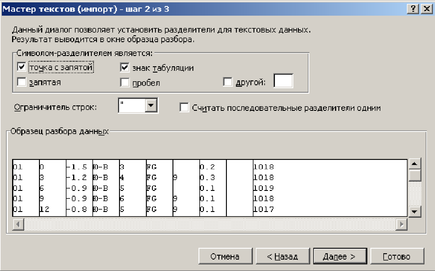 В отобразившемся диалоговом окне выберите символ-разделитель точка с запятой, как показано на рисунке 3. В окне Образец разбора данных появятся вертикальные линии, ограничивающие столбцы будущей таблицы.