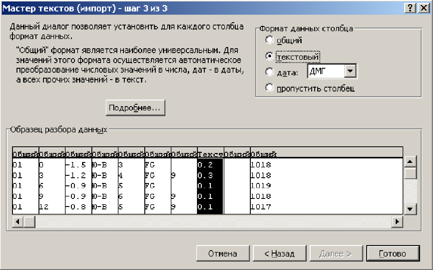 В столбиках 3 и 8 измените формат данных на текстовый, а затем щелкните на кнопке Готово.