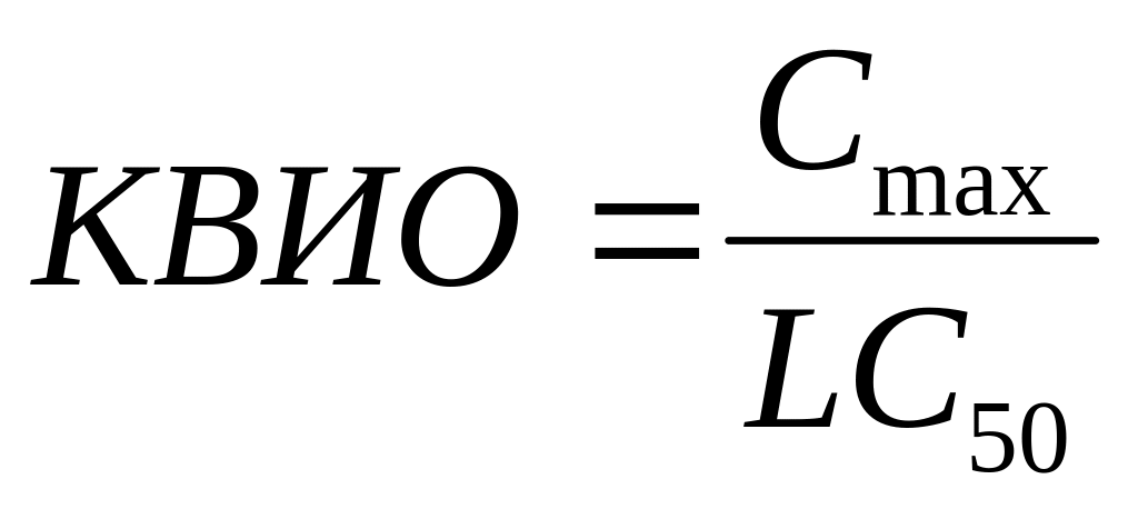 Классификация химических веществ по степени их опасности учитывает значения допустимых концентраций в воздухе при 20°С и коэффициент возможности ингаляционного отравления (КВИО). КВИО - отношение максимально достижимой концентрации вредного вещества в воздухе при 20 °С к средней смертельной концентрации для мышей.