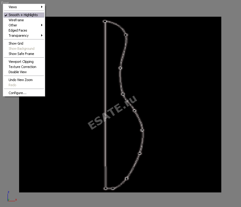 Теперь данный материал с изображением контура кегли в качестве цвета установлен для нашей плоскости, и настроен на отображение в окне проекции. В окне Perspective он уже установился. Теперь перейдем к нашему окну Front. Щелкните правой кнопкой мыши на надписи Front в левом верхнем углу окна Front. В открывшемся контекстном меню поставьте галочку напротив строки , как показано на рис. 5. После этого действия на нашей плоскости станет видно изображение контура кегли: