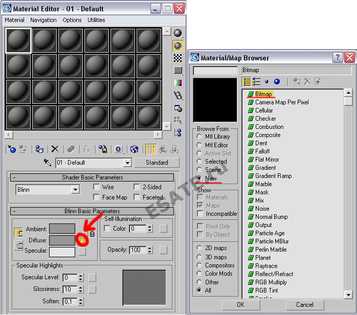 3. Нажмите клавишу M. Откроется Material Editor. Сейчас мы загрузим изображение контура нашей кегли. Свободный элемент уже выбран - теперь в свитке Blin Basic Parametrs щелкним на кнопке справа от установки цвета Diffuse, как показано на рис. 2. В открывшемся меню Material/Map Browser в меню Brouwser From выбирете new. Затем щелкните дважды на строке Bitmap , как показано на рисунке: