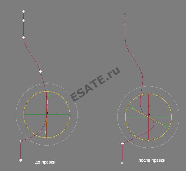 4. Для изменения угла, под которым сегмент сплайна входит в вершину, выберите инструмент Select and Move (Выделить и перемесnить), щелкните на маркере и перемещайте его вокруг вершины (рис. 3), наблюдая за изменением ориентации сегмента, которому соответствует перемещаемый маркер для вершин типа Bezier Corner (Безье с изломом) или обоих примыкающих к вершине сегментов – для вершин типа Bezier (Безье).