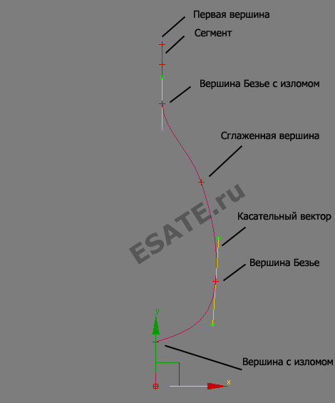 – Corner (С изломом) – вершина, в которой сплайн претерпевает излом. Участки сегментов вблизи такой вершины не имеют кривизны; – Smooth (Сглаженная) – вершина, через которую кривая сплайна проводится с плавным изгибом, без излома, имея одинаковую кривизну сегментов при входе в вершину и выходе из нее; – Bezier (Безье) – вершина, подобная сглаженной, но позволяющая управлять кривизной сегментов сплайна при входе в вершину и при выходе из нее. Для этого вершина снабжается касательными векторами с маркерами в виде квадратиков зеленого цвета на концах. У вершин типа Bezier (Безье) касательные векторы всегда лежат на одной прямой, а удаление маркеров от вершины, которой принадлежат векторы, можно изменять. Перемещение одного из аркеров вершины Безье всегда вызывает центрально- симметричное перемещение второго. Перемещая маркеры касательных векторов вокруг вершины, можно изменять направление, под которым сегменты сплайна входят в вершину и выходят из нее, а изменяя расстояние – Bezier Corner (Безье с изломом) – вершина, которая, как и вершина типа Bezier (Безье), снабжена касательными векторами. Однако у вершин Bezier Corner (Безье с изломом) касательные векторы не связаны друг с другом, и маркеры можно перемещать независимо.