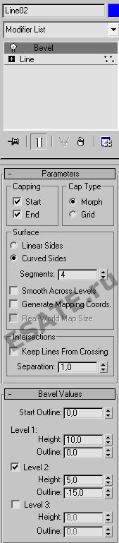 Команда Line вызывается кнопкой Line командной панели Create и позволяет создавать линии практически любой требуемой формы. При выполнении команды мышью фиксируются места расположения вершин и настраивается их кривизна. Полученный сплайн можно замкнуть. В разделе Interpolation свитка General устанавливается режим оптимизации числа шагов, на которые разбиваются сегменты между вершинами.