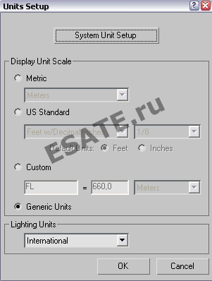 Последний тип единиц измерения принимается по умолчанию и представляет собой просто десятичные числа, такие как 1, 100, не имеющие конкретной размерности. Эти единицы можно условно принимать как футы, дюймы или любые другие меры длины. Настройка единиц измерения осуществляется в окне диалога, появляющемся после выбора команды меню Customize –> Units Setup (Проекции –> Единицы Измерения) (рис. 1).