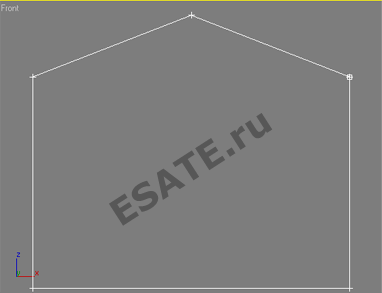 4. Примените к нему модификатор Edit Spline, зайдите на уровень Vertex и с помощью команды Refine добавьте точку по центру верхнего ребра прямоугольника. Чтобы попасть точно в центр ребра, включите объектные привязки Midpoint. Приподнимите добавленную вершину, чтобы образовался фронтон (рис. 2).