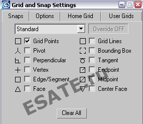 4. Настроим привязку. Выберите команду Grid and Snap Settings (Настройка сетки и привязок) меню Views (Customize (Настройка)) и на вкладке Snaps (Привязки) установите привязки к узлам сетки (Grid Points) и привязки к вершинам объектов (Vertex).