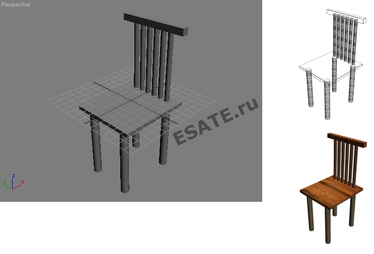 13. Снова выберем инструмент Select and Move и в окне проекции Front переместим каждый цилиндр до касания сиденья стула сверху.