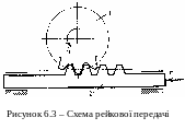 Рейкова передача призначена для перетворення обертального руху шестерні в поступальний рух рейки і, навпаки, поступального руху рейки в обертальний рух шестерні (рисунок 6.3). Основними ланками рейкової передачі є шестерня 1 і зубчаста рейка 2. Рейка утворює з нерухомою ланкою поступальну пару. Рейкову передачу можна розглядати як окремий випадок зубчастої передачі, в якій колесу трансформоване в рейку.