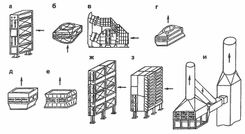 у вигляді блоків, що спираються на власні опори (див. ріс.6.13, а, в, ж, з, і). Інші спираються на газоходи — продовження вихлопних патрубків ГТУ (див. мал.6.13 б, г, д, е). Є приклади з явно вираженими обвідними (байпасні) газоходами (у ГТ-6-750 і ГТК-10І, див. рис. 6.34, в, і). У решті байпаси вбудовані.Модулі встановлюються або вертикально (по фронту набігаючого потоку продуктів згоряння), як у ГТК-10, ГТ-6-750, ГТН-16, ГТН-25 (див. ріс.6.13, а, в, ж, з), або горизонтально (інші варіанти). Останні використовують самотягу, що зменшує аеродинамічний опір газового тракту. Модулі запитані по потоку продуктів згоряння як послідовно, так і паралельно.У всіх варіантах модулі виконані у вигляді блоків, вставлених по напрямних в осередку теплоутилізаційних установок. Типова конструкція модуля має зварний листової корпус з фланцем для кріплення в комірці і перегородками для підтримки трубного пучка; вхідну і вихідну водяні камери з фланцями для приєднання та вкінці водяних трубопроводів; патрубок дренажу по воді; патрубок для випуску повітря при заповненні водою; систему роликів для полегшення вставки модуля в клітинку і виймання з неї. Трубні пучки, як правило, багатоходові по воді, виконуються у вигляді змієвиків (зокрема, з U-подібними трубками) або мають плаваючі поворотні камери; такі рішення знімають проблему термічних переміщень трубного пучка відносно корпуса.