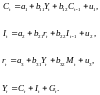 Перше рівняння – функція споживання, друге рівняння – функція інвестицій, третє рівняння – функція грошового ринку, четверте рівняння – тотожність прибутку.