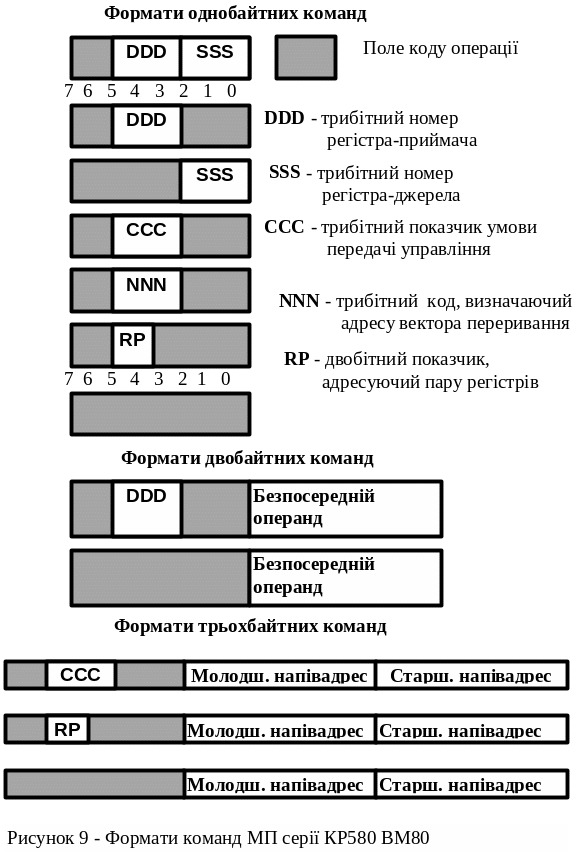 Система команд МП серії КР580ВМ80 містить команди трьох форматів: однобайтні, двобайтні і трьохбайтні.