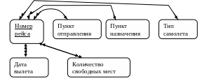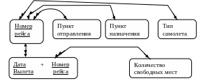 Поскольку все элементы данных в примере относятся к рейсам самолетов, то ключом логической записи логично было бы выбрать номер рейса. Действительно этот атрибут обладает основным свойством ключа – каждый рейс имеет свой уникальный номер. Связи между элементами определяются ролью каждого из них по отношению к ключу. Так, из пункта отправления могут отправляться много рейсов, но каждый рейс имеет только один пункт отправления, поэтому связь между ними со стороны ключа будет М:1. Следовательно, эти атрибуты можно объединить в логическую запись. То же касается атрибутов «Пункт назначения», «Тип самолета». Между ключом и атрибутом «Дата вылета» существует связь М:М, так как один и тот рейс может вылетать в разные даты, а в одну и ту же дату могут вылетать разные рейсы, то есть эти атрибуты нельзя объединить в логическую запись. То же касается и атрибута «Количество свободных мест». Однако эти два атрибута несут существенную информационную нагрузку и должны быть включены в модель. Чтобы решить эту проблему, можно преобразовать схему так.