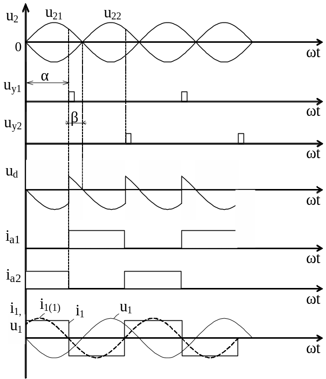 В инверторном режиме для характеристики управления используют угол опережения = . Минимальный угол опережения должен удовлетворять условию мин> tвос, где tвос – время восстановления запирающих свойств тиристора. Если это условие по каким-то причинам не выполняется, происходит опрокидывание инвертора. Это аварийный режим, когда открыты оба тиристора, через которые протекает ток короткого замыкания. Рис. 2