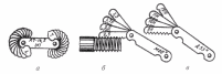 Металлическая линейка (рис. 3.6.3, а), кронциркуль (рис. 3.6.3, б) и нутромер (рис. 3.6.3, в) позволяют измерить внешние и внутренние размеры с точностью до 0,1 мм. Штангенциркуль, предельная скоба, калибр, микрометр позволяют выполнить более точный обмер (рис. 3.6.4, а, б, в, г). Замер радиусов скруглений производят с помощью радиусных шаблонов (рис. 3.6.5, а), а шаги резьбы замеряют с помощью резьбовых шаблонов (рис. 3.6.5, б, в).