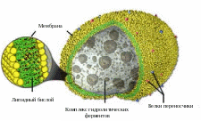 Лизосомы представляют собой пузырьки, окруженные одиночной мембраной и содержащие полный набор ферментов для расщепления практически любого компонента клетки. Лизосомы, по-видимому, образуются из мембран Гольджи. В клетках, способных захватывать частички пищи (например, у амеб), лизосомы являются источником ферментов для ее расщепления. Лизосомы переваривают также «отработанные» или излишние клеточные компоненты, в том числе митохондрии. Лизосомы — жизненно необходимые клеточные органеллы.