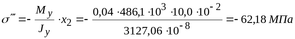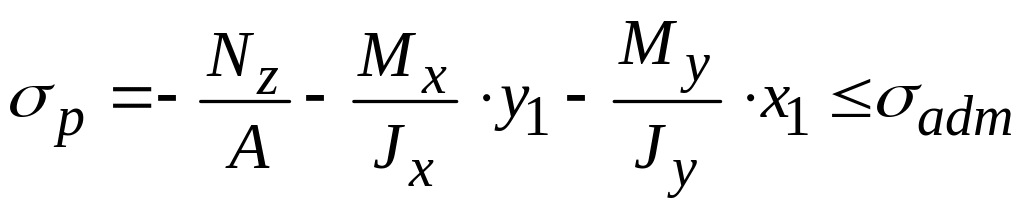 4. Составляем условие прочности для точки 1 с максимальным результирующим сжимающим напряжением. Знаки напряжений в точке сечения от определяем по эпюрам напряжений.