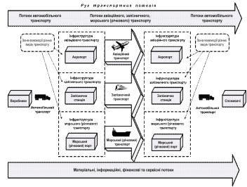Рух транспортних потоків кожного виду транспорту, в умовах ринку, необхідно розглядати як галузеву систему, де транспортні підприємства, учасники процесу, об’єднані горизонтальними зв’язками (зв’язками партнерства), працюють у взаємодії та виконують свої галузеві функції в загальному процесі змішаних перевезень. Зони взаємодії різних видів транспорту при перевезенні вантажу за логістичним принципом „Від дверей до дверей” представлені на рис. 1.