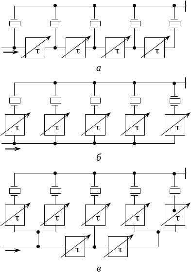 Смешанная схема является сочетанием двух рассмотренных ранее. Число последовательно включенных задерживающих звеньев здесь меньше, чем в последовательной схеме; их использование позволяет значительно снизить диапазон необходимых задержек, которые должны обеспечить параллельно включенные звенья. Уменьшение числа последовательно включенных задерживающих звеньев снижает роль ошибок управления, что имеет важное значение, особенно при большом числе пьезопреобразователей в антенной решетке.