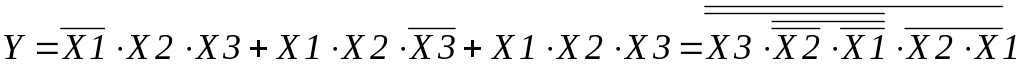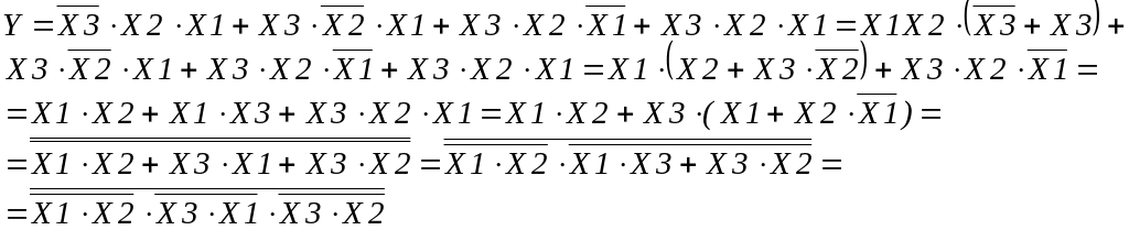 Этап 2. Запись логической функции. Логическую функцию, описывающую условия, при которых выходной сигнал равен единице, записывают в виде логической суммы, число членов которой равно числу в колонке Y таблицы состояния. Каждую сумму записывают как произведение входных сигналов для тех состояний, в которых Y=1. Если входной сигнал равен нулю, то он входит в произведение со знаком инверсии. Для таблицы состояний (табл. 8.1) логическая функция имеет вид: