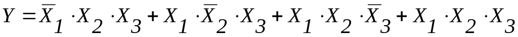 Логическая функция определяет условия, при которых Y=1. Эти условия могут возникнуть в четырёх случаях, каждый из которых характеризуется определённой комбинацией значений трёх входных сигналов.