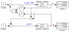 Оскільки дана система рівнянь має два рішення, то початкові значення блоків Algebraic Constraint задані у вигляді векторів. Для першого (верхнього) блоку початкове значення задано вектором [1 -1], а для другого (нижнього) блоку - вектором [-1 1].